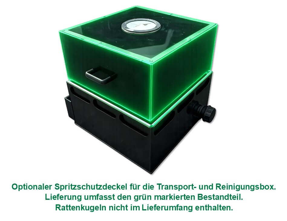 Mit dem Spritzschutzdeckel lassen sich Rattenkugeln direkt im System reinigen – schnell, effektiv und ohne zusätzlichen Reinigungsaufwand.